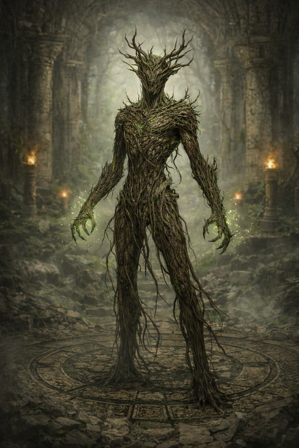 На платформе скрывался постамент со Скрижалью, накрытой цилиндром защитного поля. Сейчас она опускалась к уровню колдуна, и вместе с ней... Нечто еще. Существо, похожее на гуманоидную фигуру из лоз, лиан и органической плоти. У него нет глаз, но ощущение взгляда дает представление о том, что оно видит непрошенных гостей, прижавшихся к аркам, словно крысы к норам.